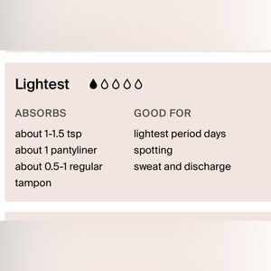 🔹So thin, you'll forget you're wearing anything. Our original leakproof technology offers a barely-there feel while absorbing about 1 regular tampon or pantyliner worth of liquid.