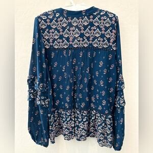KNOX ROSE | Blue Boho Floral Peasant Blouse Long Sleeve Ruffle Hem | Size Small