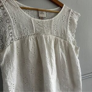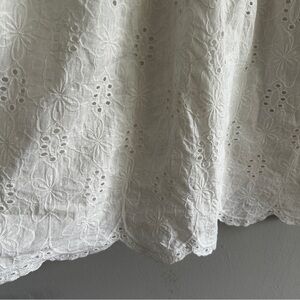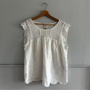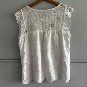 Great pre-owned condition white eyelet top with flutter sleeves. Floral print. Lined. Size large.