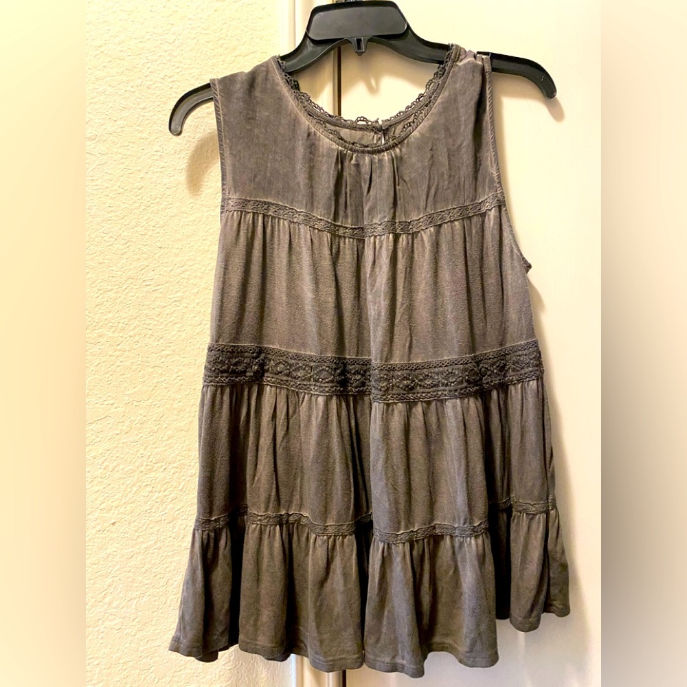 KNOX ROSE SWING/FLARE TOP-Greenish/Grey. A few minor fabric fuzz balls that can be removed with a clothes shaver but not really noticeable.