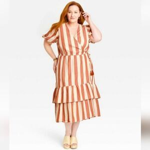 BRICK RED & CREAM STRIPE SHORT SLEEVE COTTON WRAP MAXI DRESS WITH POCKETS SIZE XXL WITH PUFFY SLEEVES TIERED RUFFLE SKIRT BY KNOX ROSE PRE OWNED LIKE NEW CONDITION
