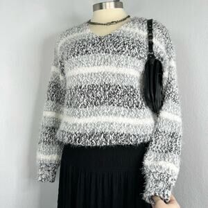 Know Rose Fuzzy Striped Black White Gray Sweater Size Large, Good Condition