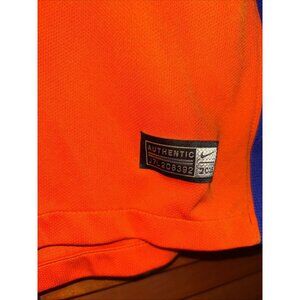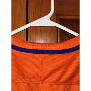 The KNVB Netherlands Football Soccer Jersey is a men's size medium jersey in the iconic orange color of the Dutch national team. Made by Nike with Dri-Fit technology, this jersey is designed for soccer enthusiasts who want to show their support for the Netherlands team. This officially licensed jersey is perfect for fans looking to represent their favorite team on and off the field. Made in Thailand, this jersey is a stylish and comfortable choice for any soccer fan.