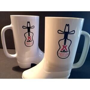 Set of (2) hard plastic boot shaped beer mugs. Each side has the KOA logos with cowboy hat and guitars. They show burr marks, dings, and age wear. Still display great. Size is 6" tall and about 6" wide.