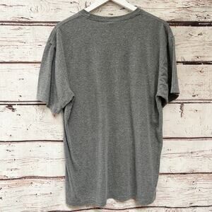 Good condition!! Does have small stain (see photo) but it blends in pretty well with the dark heather gray of the shirt.