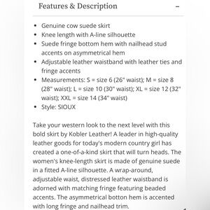 Introducing the stunning Kobler Leather Women's Leather & Fringe Sioux Suede Skirt in size M, now available in excellent used condition on Poshmark! This beautiful piece features a soft and supple suede material, delicately accented with fringe detailing along the hemline for a touch of bohemian flair. The skirt also boasts a flattering A-line silhouette that hugs the waist and falls gracefully to the mid-thigh, making it the perfect addition to any stylish wardrobe. Whether you're dressing it up with boots and a blouse or keeping it casual boho. This Kobler Leather skirt is sure to turn heads wherever you go. Don't miss out on this one-of-a-kind piece!