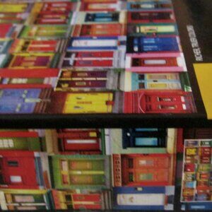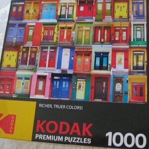 KODAK JIGSAW 1000 PIECE COLORFUL PUZZLE OF DOORS...this 1000 piece jigsaw puzzle is great to bring the family together on a cold or dreary winter day. Set up on a large surface (we used our dining room table) and pass the hours with fun for the family. We also could leave it unfinished and return the next day to work on it again. We had hours of fun with lots of laughs! It will ship in the box shown and wrapped for delivery to you. All 1000 pieces are included. No returns on this one. Consider his one for a holiday gift for someone on your guest list.