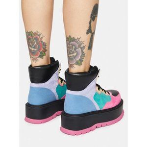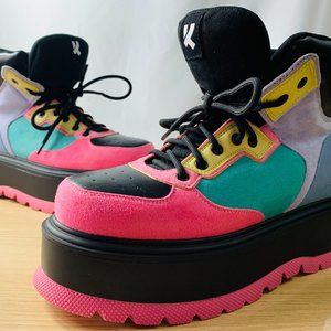 Koi Footwear Black Sumikko Platform Sneakers feature a color block design, faux suede uppers, front lace up closures, and platform soles.