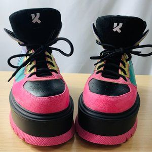 These platform sneakers are in great shape aside from a small spot on one of the laces (see pictures), this can easily be replaced. These were worn once or twice, but practically brand new!
