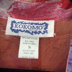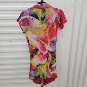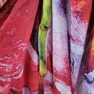 Vibrant dress with an abstract print in red, pink, and yellow. Features a unique draped design.