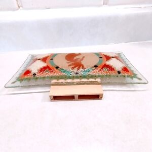 This beautiful tray is a unique piece of fused art glass that is sure to add a touch of boho elegance to any space. It was handcrafted by Peggy Karr in 2002 and features a stunning Aztec pattern in multicolor. The tray measures 6 inches in length and 10 inches in width, with a height of 6 inches.