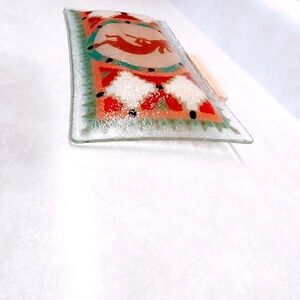 This original piece has a glossy finish and is made of fused glass. It is suitable for hand washing only and comes unboxed. The tray is signed by the artist. It is perfect for contemporary style and adds a vintage touch to any collection.