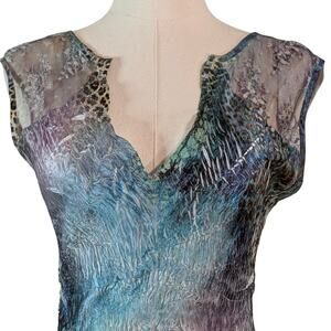 Stunning Komarov maxi dress featuring an ethereal mixed print design with metallic accents. This sleeveless dress showcases a flattering V-neckline and flowing silhouette perfect for special occasions or elevated everyday wear.