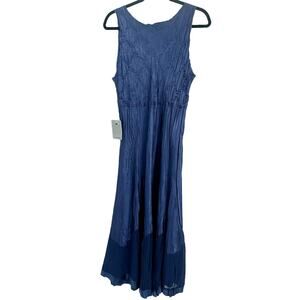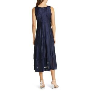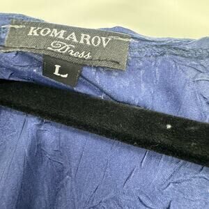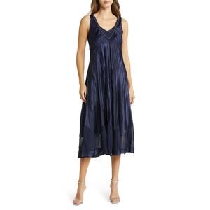 KOMAROV Women's Navy Beaded Charmeuse & Chiffon Tiered Midi Dress Size L NWT. From suitcase to sensational entrance, this wrinkle-resistant combo of charmeuse and chiffon is cut into a tiered-ruffle dress brimming with rich texture. Dress has V-neck; sleeveless. Unlined. 100% polyester. Dry clean or hand wash, dry flat. Made in the USA.