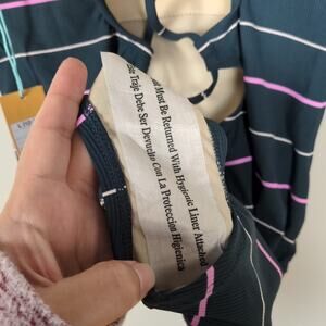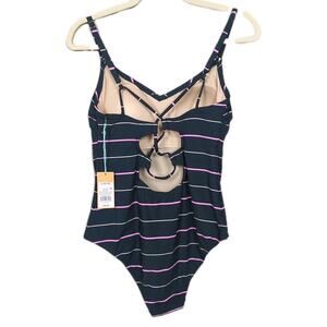 Dark green, pink, and white striped medium coverage one-piece swimsuit with open laced back and adjustable straps by Kona Sol. Cups are lightly padded. MSRP $39.99