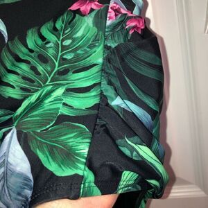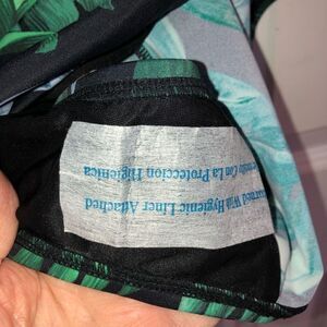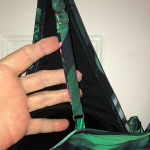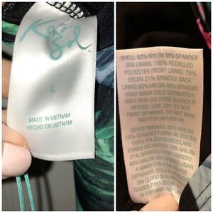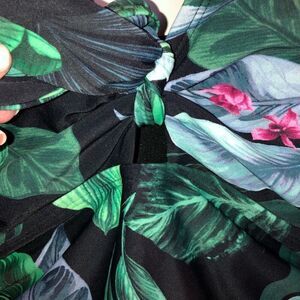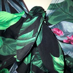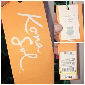 I love this bright tropical print from Kona Sol. It’s in ladies size large. MSRP $42. This one-piece is full coverage with tummy control and a tie front. Full seat coverage and sewn-in cups. V neckline with bow tie accent and keyhole in the front. Straight back and adjustable straps. Side ruching which creates draping in the tummy area, camouflaging the stomach.. It’s 82% nylon and 18% spandex. The pit-to-pit measurement is 17” (without stretching) and it is 30” from the shoulder to the crotch.  This is a real cutie and it’s NWT! 🌴🌺