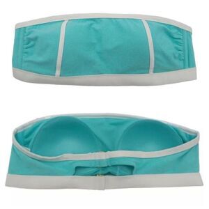 Kona Sol makes this Terry-Textured Bandeau Bikini Top with Binding in ladies size 1X (16W - 18W) in beautiful turquoise with white trim. Give your swimwear wardrobe a chic, versatile update with this bandeau bikini top. Made from soft fabric with spandex for stretchy comfort in and out of the water, this bandeau bikini top is designed in a French-terry textured solid turquoise with binding. Pair it with solid or printed bottoms, or wear it with your favorite shirt (unbuttoned, of course). Sewn in slightly-padded cups (non-removable) and adjustable, removable straps (still in the bag) for different styling. Back hook-and-loop fasteners (also adjustable). The shell is 94% nylon and 6% spandex; the lining is 100% polyester. So hand wash in cold and line dry. MSRP $25. Super cute and NWT.