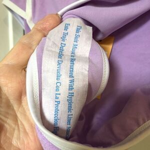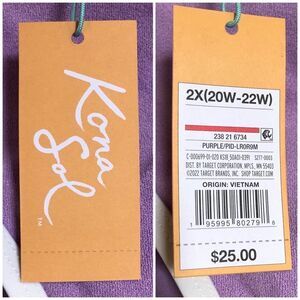 Kona Sol makes these terry-textured, solid high-waist, high-leg bikini bottoms. The color is Amethyst Purple (lavender), and they are in ladies size 2X. They’re new with tag, and the sanitary strip is in place. The shell is 94% nylon and 6% spandex. The lining is 100% polyester. Hand wash and line dry. NWT!