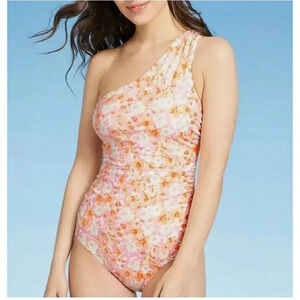 Women's Kona Sol (from Target) beautiful watercolor pastel orange, yellow, and pink floral one-piece swimsuit bathing suit, size 24W. Swimsuit features a wide one-shoulder strap and another traditional skinny adjustable strap that can also be removed completely to make this just a one-shoulder swimsuit. Measurements are approximately 5" to the neckline, 32" in length and 21.5" bust. Material content is (shell) 82% polyester/18% nylon (lining) 100% polyester.