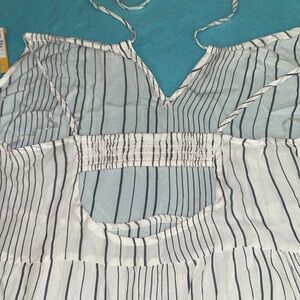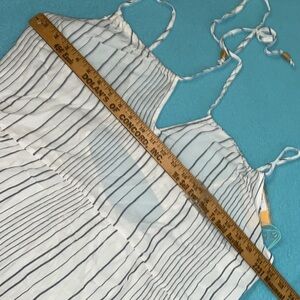 KONA SOL tiered maxi dress striped adjustable spaghetti straps that tie wooden beads key hole and elastic at back, white with gray stripes, semi sheer, pullover, beachy,, flowy, swim cover, spring, summer.