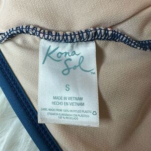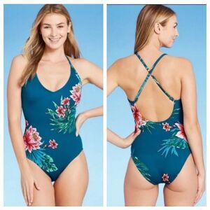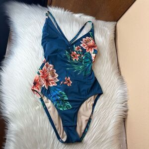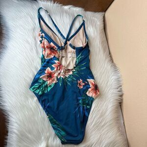 KONA SOL Criss-Cross Blue Tropical Floral Print One Piece Swimsuit Size small. Very minor wear to bum. Please see all pics.