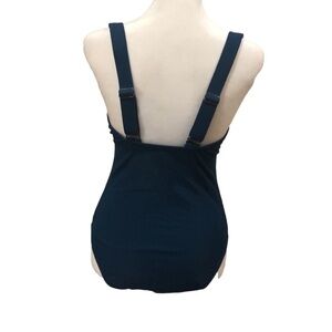 Kona Sol one piece swimsuit. Dark teal. Ribbed stretch fabric. V-neck front can be extended with front zipper for more exposure. Soft molded cups. One inch wide adjustable straps. Very good pre-owned condition. Strap attachment site on the right back needs minor repair. Area is shown in pictures above. Size S