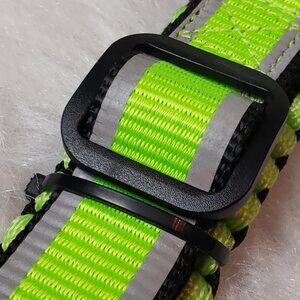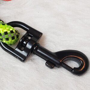 Details: This stylish strap harness is adjustable and reflective. Accented with sections of braided paracord and a rubber Kong logo sewn over the strap. Black metal D-ring for attaching your leash. The quick release buckle allows easy disengagement - the clasp is metal; the interlocking piece is plastic. The slide adjuster is also plastic. The coordinating rope leash has a metal swivel leash hook. It is also reflective for additional safety and has a comfort grip handle.
