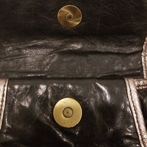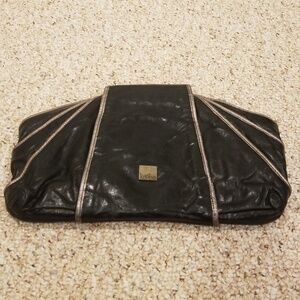 Kooba Black with Silver Zippered Clutch with snap closure as well. So soft! Used with some flaws. Some scratches on the metal, few marks on the inside and some flaws on the leather. Pretty and the flaws aren't apparent when worn. No box or dustbag.