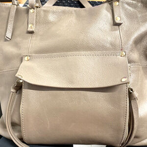 KOOBA Everette Large Leather Satchel Tote Bag Dark Beige Pockets Tassels Zippers