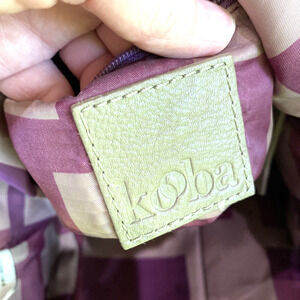 Vintage Y2K Kooba Everette Large Leather Satchel Tote Bag Puse. This designer handbag is perfect for most needs - travel, casual outings and even career/business. Zipper top closure and goldtone hardware accents including a logo tag on the front. The exterior is a dark beige color that will go with everything. Exterior front pocket expands with side zippers and closes with a magnet, Exterior side zippers expand the bag when you need the extra room. Interior is lined with a purple/beige pattern satin fabric that includes one zipper and two slide pockets. This bag is beautiful but sadly the stitching on one strap appears to be coming loose (see pic). In otherwise good vintage condition - minor surface wear - no significant damage or flaws - functional and gorgeous!