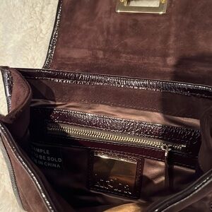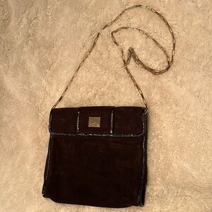 KOOBA brown suede crossbody with gorgeous gold chain and patent leather piping.