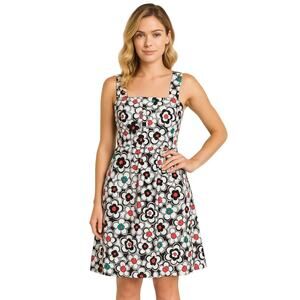 Retro-inspired floral sundress from KOOP, made in the USA. This sleeveless dress features a square neckline, wide straps, and an A-line skirt. Bold black, white, red, and turquoise floral print makes this a fun summer or festival piece.