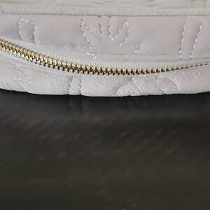 KOPARI makeup travel bag. Use for travel, makeup, cosmetics, toiletries, skincare and more. Bag zips up and have very soft material on outside. Inside bag is lined. Has embroidered Palm Trees all over bag.