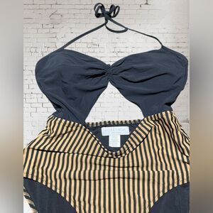 This stylish kids one piece features a striking black and gold striped design. Perfect for a day at the beach or pool.