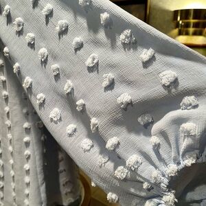 This is a lovely KORI AMERICA Women's Size S Light Blue Distressed Pom Pom Fringe Long Sleeve Tunic Blouse. So dreamy with its sheer, yet layered styling and Boho romantic balloon sleeves that are elasticized at the wrists. Distressed pom-pom accents. Intricately woven chiffon like fabric made of 100% polyester for easy care. Item is in nice pre-owned condition. Color in person may vary from photos due to one's own lighting conditions.