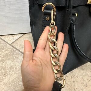 Chic black satchel with gold chain accents. Stylish and versatile design. Can be used as a handbag or shoulder bag. Shoulder strap is adjustable.