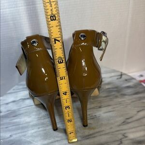 Step into elegance with these KORS Michael Kors brown heels, featuring a sleek stiletto design and chic crisscross straps for a sophisticated look. The adjustable ankle closure ensures a perfect fit, while the subtle platform adds comfort and stability. Ideal for making a statement at any event, these heels are a must-have addition to your shoe collection.