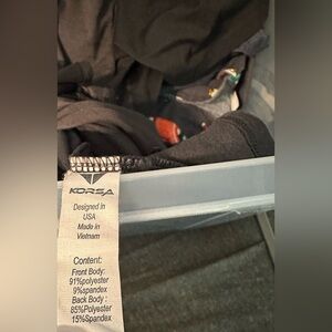 KORSA by Roadrunner Sports performance T-shirt in black and gray, size XL. Lightweight, breathable fabric with contrast stitching and a chest pocket. Designed in San Diego, California; made in Vietnam. Ideal for workouts, running, or casual wear.