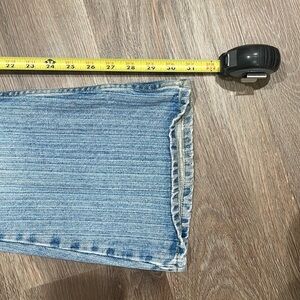 These kosiuko jeans are a size 29 (sizing may vary so pls see measurements in photos) and are a low rise flare Jean with a sick wash. I bought these for myself but they didn’t end up fitting. Button closure and 100% cotton. There is slight fraying on the bottom of one jean leg and one of the belt loop straps had partly come off but I think will be an easy thing to fix (see photos). 31” inseam, 10”front rise, 29” waist.