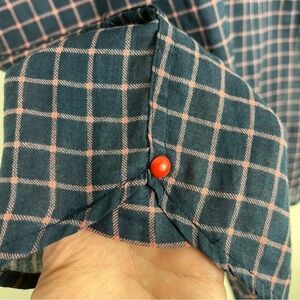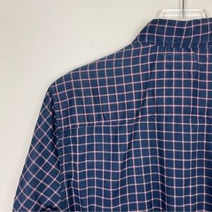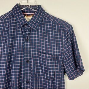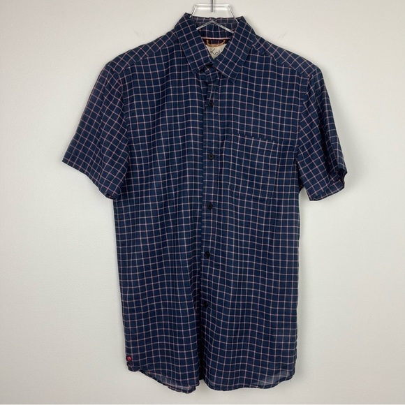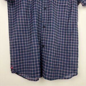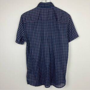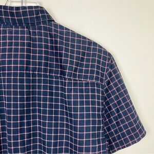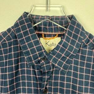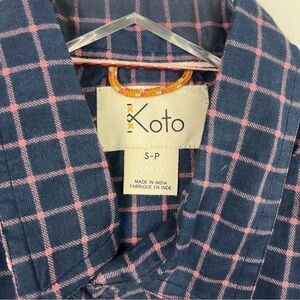 Lightweight short sleeve button up shirt by Koto from Urban Outfitters. Navy and pink windowpane plaid design. Size small. Pre-owned, excellent condition. 100% Cotton.