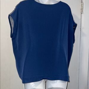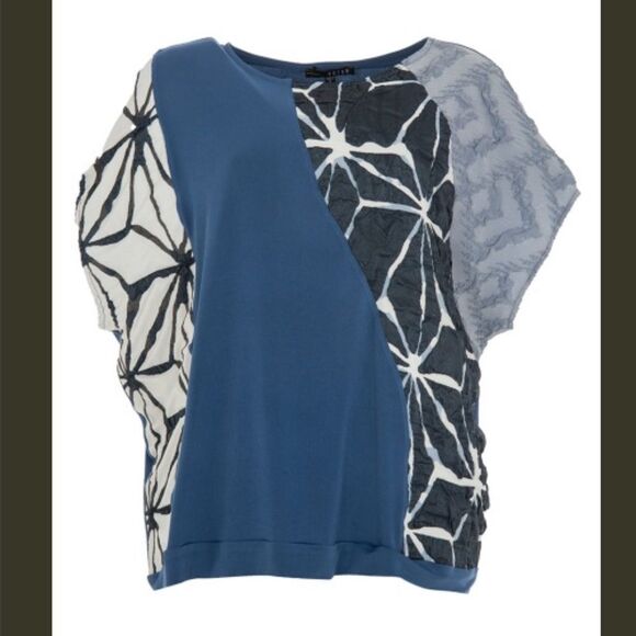 Kozan's Salem Top offers a relaxed fit with dolman short sleeves and a loose body. The combination of this season's fabrics in ice shatter print, sky blue geometric texture, and marlin blue jersey are paneled in a flattering asymmetric way. Pairs easily with a variety of bottoms for a cool look! Washable polyester spandex blend. Some pilling on the front (see pictures) but overall great condition. Size XS, measures 25” from armpit to armpit and 23”from top of shoulder to bottom hem.