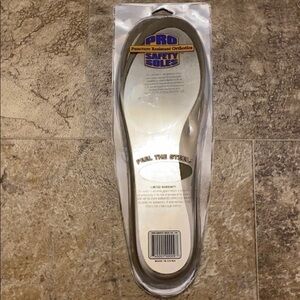New in package just shelfware to package. Protect your feet from nails and other sharp objects. I’ll check comfort slips into shoes or boots. Metatarsal support and arch support. Protective lightweight and flexible with heel cup support.