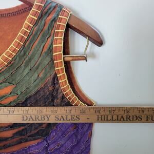 This KPC Made In Nepal 100% Cotton Multicolored Razor Cut Hand Embroidered Dress in XL size is a unique and colorful piece perfect for a casual occasion. The sleeveless tank dress features a striped pattern, scoop neckline, and pullover closure. Handmade with intricate embroidery and layered accents, this short dress is sure to make a statement with its art-inspired, hippie, and colorful design. Ideal for those who appreciate a 90s or tribal vibe, this dress is a one-of-a-kind addition to any wardrobe. Hand wash only to maintain its quality.