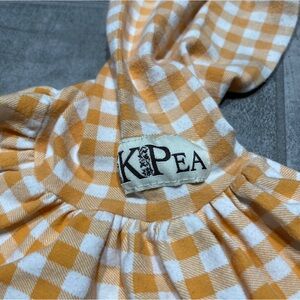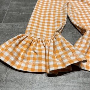 Orange and white pattern pants with a large ruffle hem. I'm a lightweight stretchy material like a legging. Has wash fading and pilling.