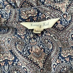 Krazy Kat v neck pearlized button front tunic with medallion style print, size S. Soft pleats with stitching in front, rounded bottom hem, longer in back, button cuffs. 100% rayon. Colors are dark/light blue, white, blush. Great with jeans! Approximate measurements are pit to pit flat 19”, length from shoulder approximately 25-27”.