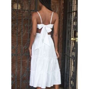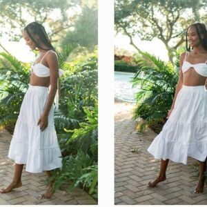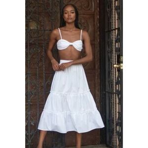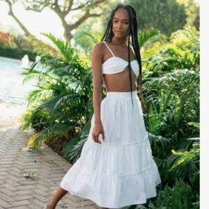 Swooning over our new Pierre Skirt. This skirt features a fixed waist with zipper back closure. Below, the full sweep, midi-skirt drops into shirred panels with a final flounce at the bottom. Pair it with our matching Barts top. Styled here with our Barts Top in White. Fabric: 100% Cotton Size & Fit: Zaria wears size Extra Small. Runs true to size. Model Measurements: Height 5' 8", Waist 25", Bust 34A, Hips 37" White Cotton A line Tiered Hidden zipper with hook and eye band waistband See additional listing for matching top as shown above TOP SOLD SEPARATELY The Barts Top is your easy, comfortable, simple, yet not simple at all, crop top. It features a knot at the chest and ties in the back making it both flirty and functional. Pair with our matching Barts skirt to really make this look pop. Styled here with our Pierre Skirt in White. Styled here with our Barts Top in White. Fabric: 100% Cotton