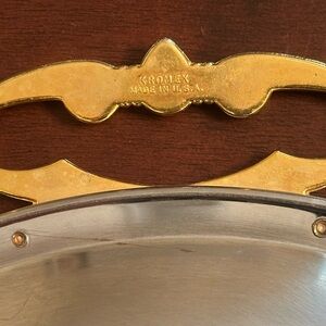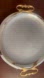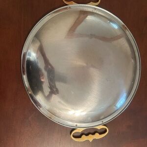 Enhance your dining experience with this KROMEX classic mid century modern round serving tray. It has a chrome plated finish with brass handles. It measures 13.5” in diameter. The brass handles are 4”W.