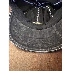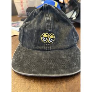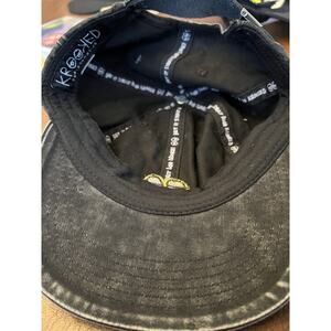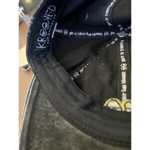 The product is a KROOKED EYES faded black denim hat featuring a patterned design.