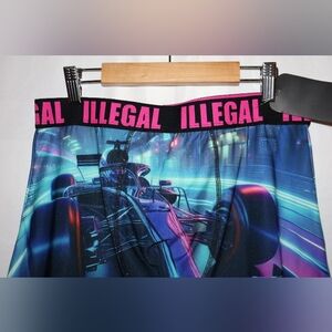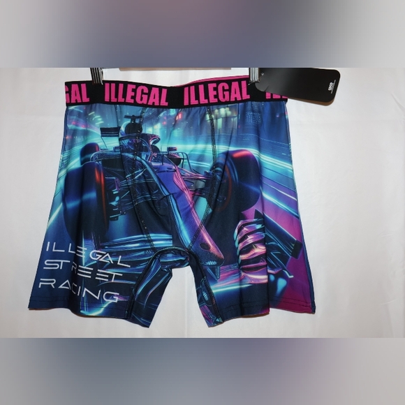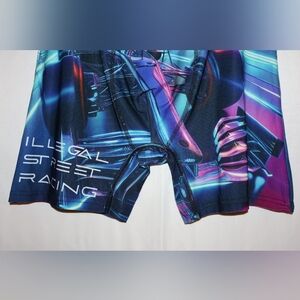 Vibrant blue boxer briefs with a racing car graphic. Features 'Illegal Street Racing' text. Large. NWT.