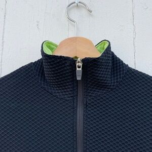 Streamlined and functional KSL biking jacket, size Small. Made with a textured black performance fabric and bright green lining for visibility and contrast. Features a full front zip, tailored fit, and back zip pocket—ideal for cool weather rides or layering. Designed for comfort and motion.